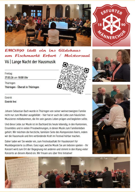 Startseite Unser Verein Personalien Konzerte / Termine Repertoire Kontakt Intern Internet-Links Thüringen feiert die Bachwochen... ... und zur “Langen Nacht der Hausmusik” öffnet der EMC 1890 seinen Probenraum für alle Gäste und musikalisch Interessierte!  Freitag 27. März 2026 um 18:00 Uhr:  Der Männerchor 1890 e.V. und Freunde laden zu Chor- und Instrumen-talmusik von Barock bis zur Gegenwart ein.  Meistersaal der Handwerkskammer,  2. Etage im Gildehaus Fischmarkt 13  99084 Erfurt.  Kommen Sie einfach herein, Sie sind herzlich Willkommen!