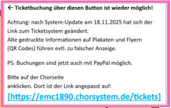Startseite Unser Verein Personalien Konzerte / Termine Repertoire Kontakt Intern Internet-Links Advent 2025:  bereits seit dem Jahr 2000 gehören die Gemeinsamen Adventskonzerte in der Thomaskirche Erfurt zum festen Konzert-geschehen in der Adventszeit für den Erfurter Männerchor.   Unter der bewährten Leitung von Christian Wolf musizieren * der EMC1890 e.V. * der Erfurter Lehrer-   chor e.V.  * und weitere musikali-  sche Freunde und gestalten so ein inzwischen traditio-nelles Konzert zur Einstimmung auf die Weihnachtszeit kurz vor dem 2. Advent.  Karten gibt’s ab Sa 08.11.2025 hinterm Rathaus bei Tourist-Info am Benediktplatz und ab sofort hier links oben ONLINE. Restkarten sind wie immer an der Abend-kasse erhältlich.  ACHTUNG: geänderte Beginn-Zeiten!   Sie sind herzlich eingeladen! Online-Buchung  Liebe Gäste, bitte hier Tickets online bestellen und bezahlen: Ticket-System