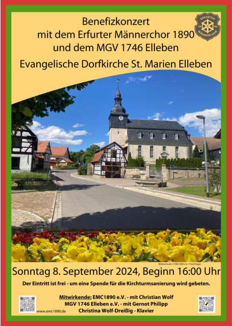Startseite Unser Verein Personalien Konzerte / Termine Repertoire Kontakt Intern Internet-Links Der Erfurter Männerchor 1890 e.V. zu Gast in der St.-Marien-Kirche Elleben  Mit einem Benefizkon-zert beginnt der EMC das zweite Chorhalbjahr nach der Sommerpause.  Liebe Gäste, Sie sind herzlich willkommen!  Bereits vor etlichen Jahren (genau am 18. April 1998) gab es ein ähnliches Konzert zu-gunsten der Sanierung der gotischen Kirche.   Aktuell wirbt Erfurts traditionsreicher Männer-chor, dieses Mal gemein-sam mit dem Elleber Männergesangverein „MGV 1746 Elleben e.V.“, wiederum um Unterstützung für die Kirchturmsanierung. Der Eintritt ist frei,  um eine Spende wird gebeten. Kontakt gerne über: www.emc1890.de